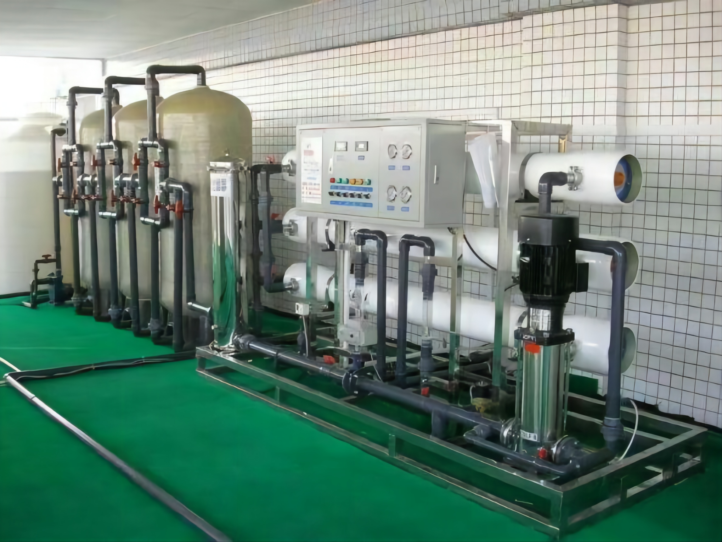 ①原水→原水泵→多介質過濾器→活性炭過濾器→軟化過濾器→保安過濾器→高壓泵→RO反滲透→純水箱→出水口(電導率≤10μs/cm);